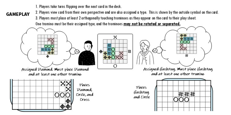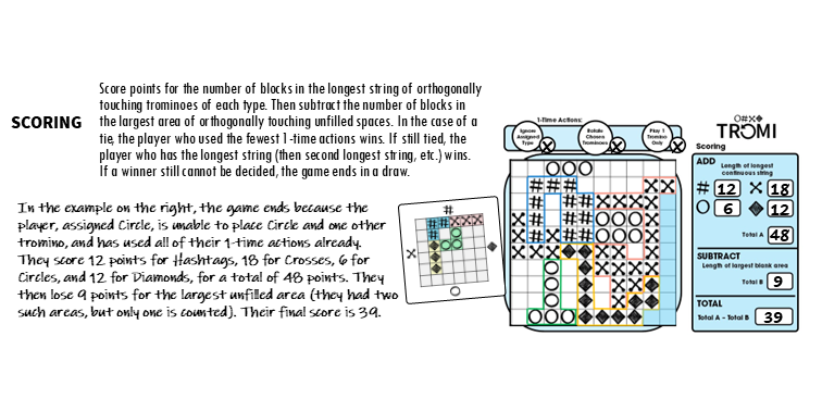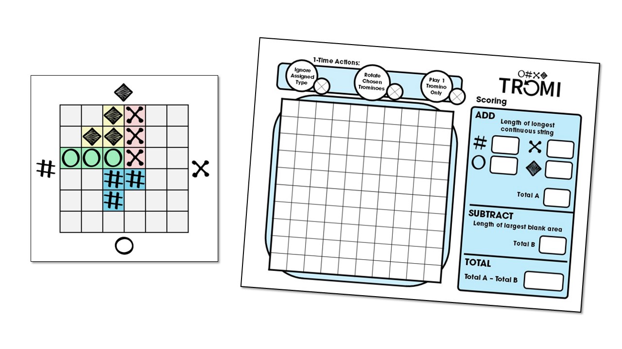 Tromi is an abstract flip & write for 1 to 4 where players fill a grid with trominoes based on their own viewpoint of a shared card. Each turn a card is drawn which assigns each player one of four symbols (the symbol closest to them). The card also shows four trominoes (shapes made up of 3 squares) in each of the four symbols. Each player, looking at the card from their own point of view, must draw their symbol's tromino along with at least one other tromino to their player sheet, without rotating or separating the trominoes. When a player cannot place their trominoes, the other players finish their turn and the game ends. Players score points for the longest string of trominoes in each symbol, and lose points for the largest empty area on their sheet. Player are also aided by three 1-time actions they can take once a game. These are: Rotate their chosen trominoes, Ignore their assigned tromino, and Play one tromino only.